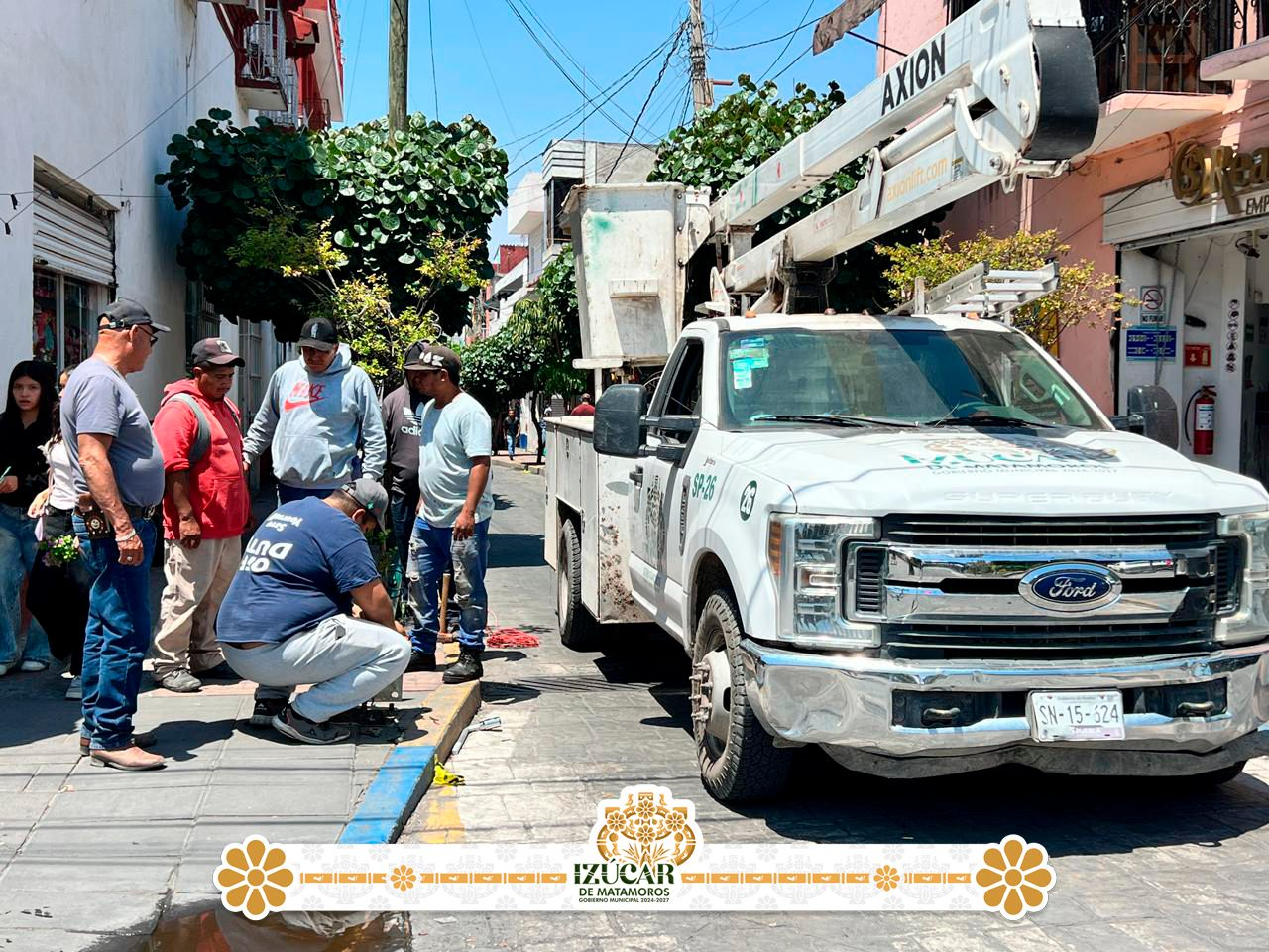 Realizan mantenimiento y mejora del alumbrado público en la calle Aquiles Serdán