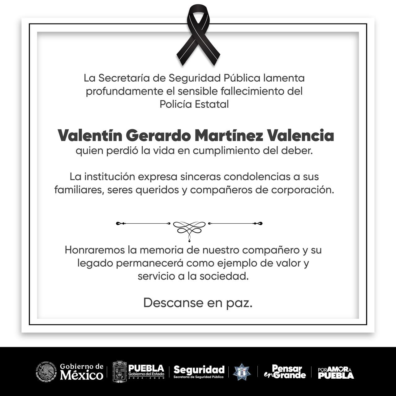 Rinde Gobierno de Puebla homenaje a policía estatal fallecido en patrullajes de vigilancia
