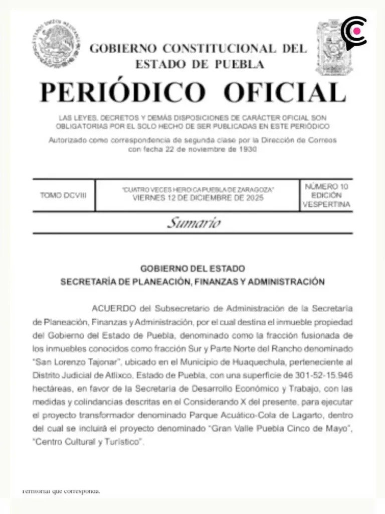 El Gobierno del Estado de Puebla asignó formalmente el predio conocido como Rancho San Lorenzo Tajonar, ubicado en el municipio de Huaquechula, para la construcción de un parque acuático que albergará el Centro Cultural y Turístico “Gran Valle Puebla Cinco de Mayo”. La decisión quedó establecida mediante un acuerdo publicado el pasado 12 de diciembre de 2025 en el Periódico Oficial del Estado.