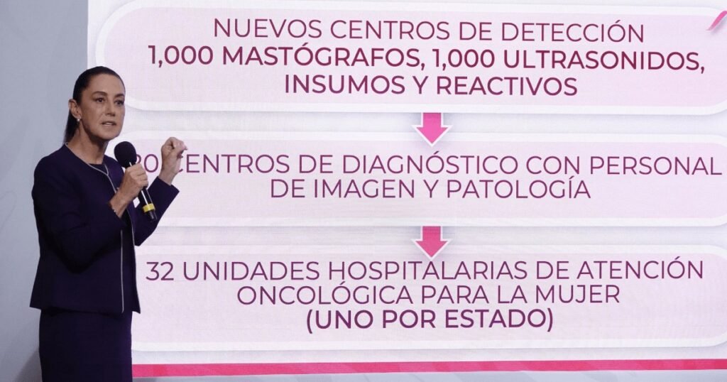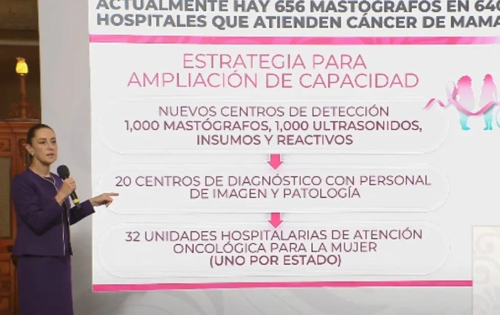 Claudia Sheinbaum, explicó que el modelo universal para la atención del cáncer de mama tendrá un costo aproximado de 8 mil millones, financiado a partes iguales por el IMSS y por el Gobierno de México a través del ISSSTE y del IMSS Bienestar. Asimismo, señaló que se fomentará la autoexploración desde los 20 años y la mastografía bianual para mujeres mayores de 40.