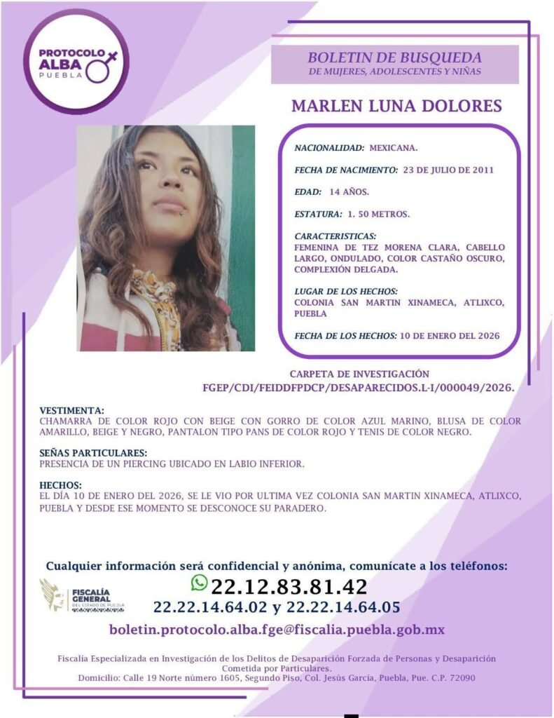 El primer caso corresponde a Marlen Luna Dolores, de 14 años de edad, quien fue reportada como desaparecida el pasado sábado 10 de enero en la colonia San Martín Xinameca. Es descrita como de tez morena, complexión delgada, con cabello largo y ondulado. Como seña particular, cuenta con una perforación tipo piercing en el labio inferior.