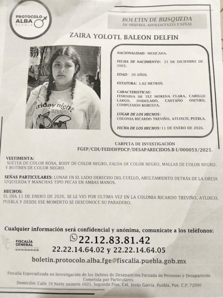 El segundo caso es el de Zaira Yolotl Baleón Delfín, de 20 años, quien fue vista por última vez en la colonia Ricardo Treviño. Mide aproximadamente 1.62 metros, es de tez morena y tiene cabello largo, ondulado y castaño. Entre sus señas particulares se encuentran un lunar en el lado derecho del cuello, un abultamiento detrás de la oreja izquierda y manchas tipo pecas en ambas manos.
