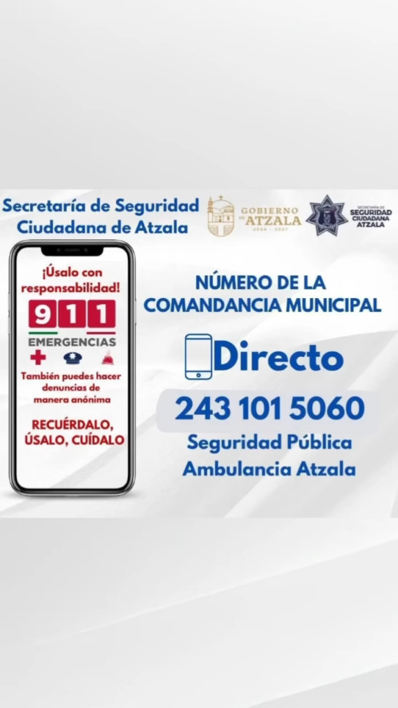 Entre los números proporcionados se encuentran el 911, como línea de emergencias, y el de la comandancia municipal: 243 101 50 60, disponibles para reportes y solicitudes de apoyo. La estrategia busca que los residentes cuenten con información accesible, para comunicarse de manera directa con las autoridades en caso de requerir asistencia.