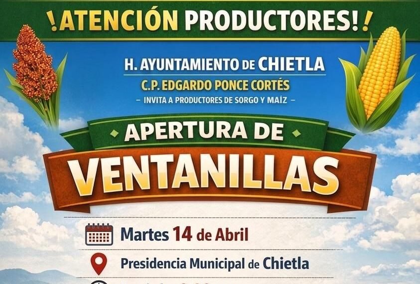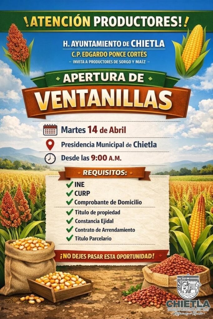 El H. Ayuntamiento de Chietla, encabezado por el presidente municipal Edgardo Ponce Cortés, informó sobre la apertura de ventanillas de atención dirigidas a los pequeños productores de temporal de sorgo y maíz de la región.