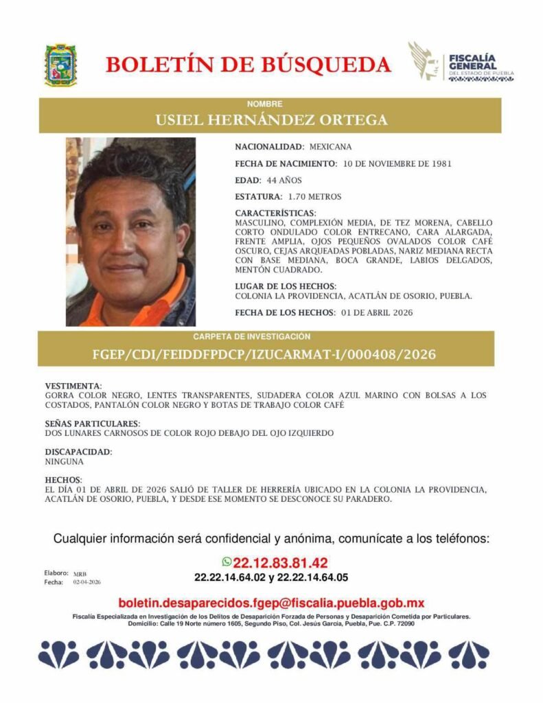 Las autoridades solicitan a la ciudadanía que cualquier dato que ayude a su localización sea reportado de manera confidencial y anónima a los números 22 12 83 81 42 y 22 22 14 64 02, así como al correo boletin.desaparecidos.fgep@fiscalia.puebla.gob.mx.