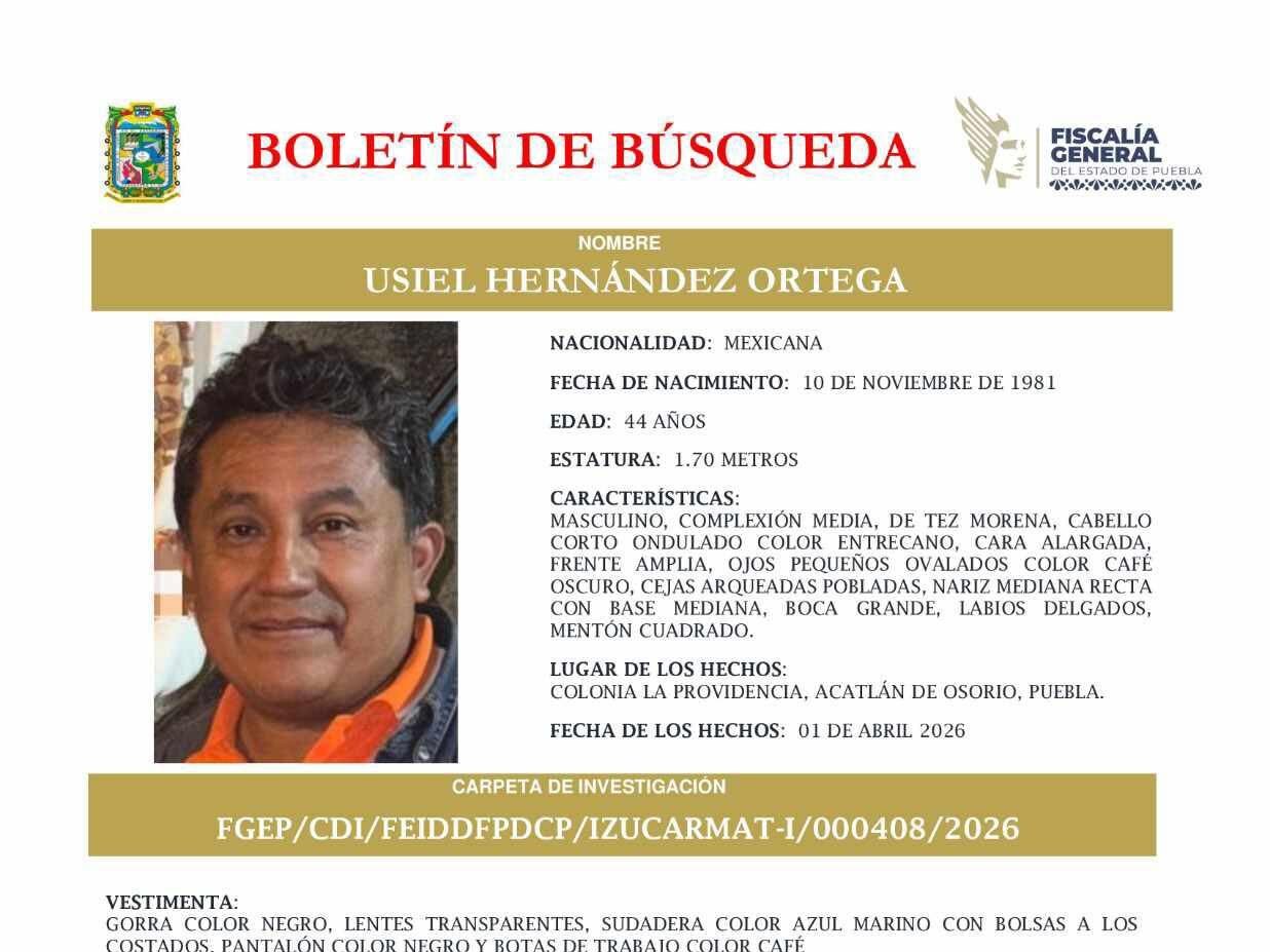 Autoridades y familiares buscan a Usiel Hernández Ortega, de 44 años, quien desapareció el 1 de abril de 2026 en la colonia La Providencia, luego de salir de un taller de herrería para ir a cargar gasolina y no regresar.