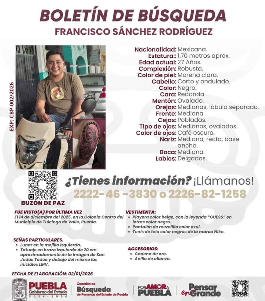 Autoridades y familiares solicitan el apoyo de la ciudadanía para localizar a Francisco Sánchez Rodríguez, de 27 años de edad, quien fue visto por última vez el pasado 14 de diciembre de 2025 en la colonia Centro del municipio de Tulcingo de Valle, en el estado de Puebla.
