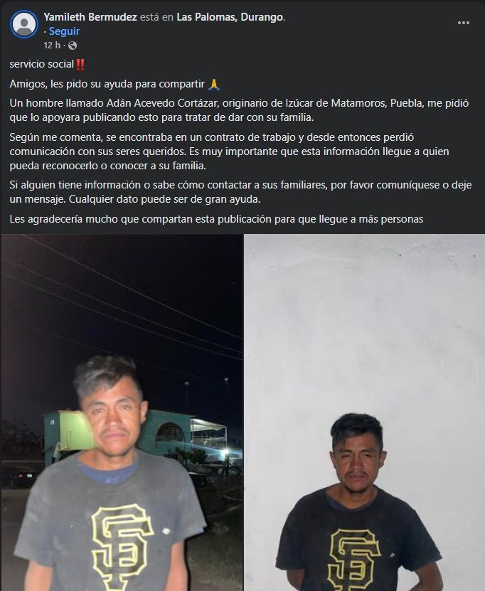 A través de redes sociales, una usuaria identificada como Yamileth Bermúdez solicitó apoyo para localizar a los familiares de Adán Acevedo Cortázar, originario de Izúcar de Matamoros, quien se encuentra actualmente en Durango tras perder comunicación con sus seres queridos.