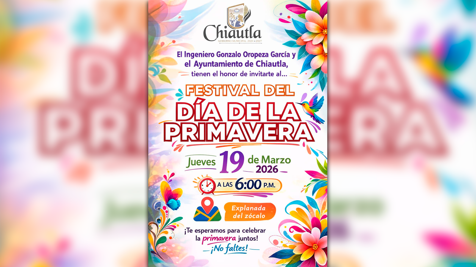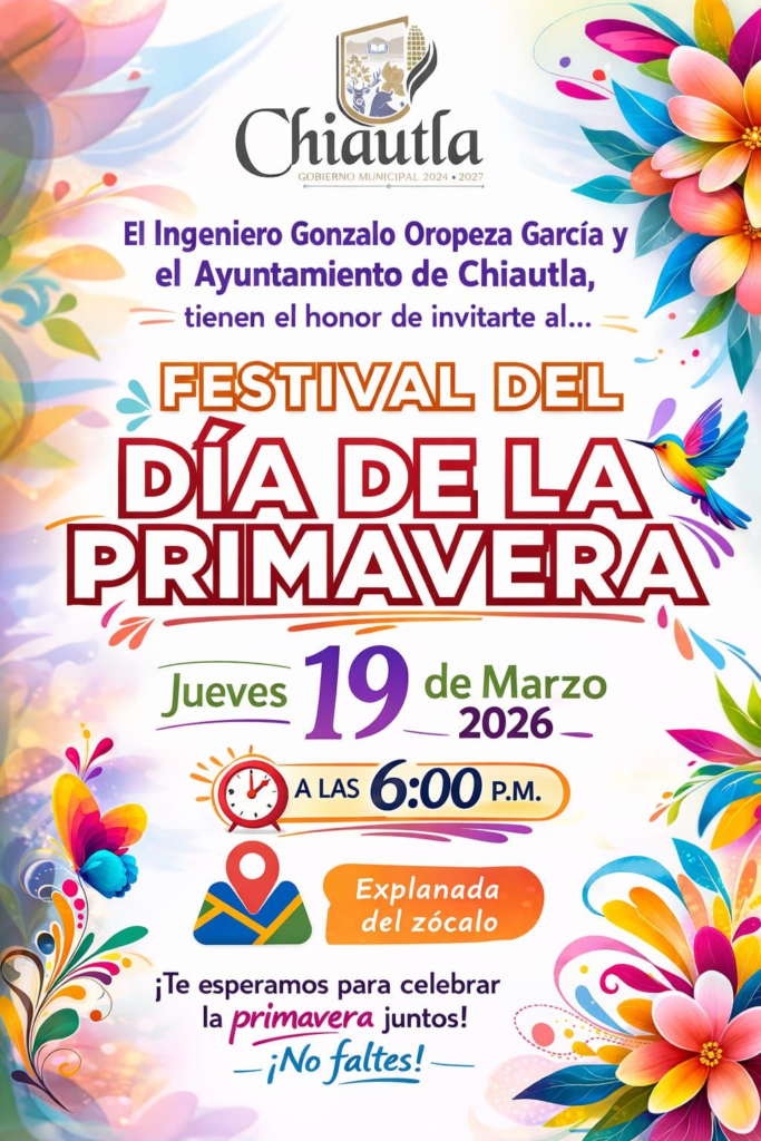 El Ayuntamiento de Chiautla de Tapia, encabezado por el presidente municipal Gonzalo Oropeza García, invitó a la población a participar en el Festival del Día de la Primavera, que se llevará a cabo el próximo 19 de marzo de 2026 en la explanada del Zócalo municipal.