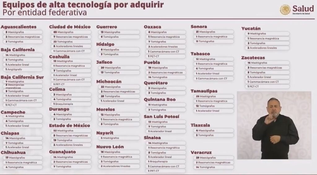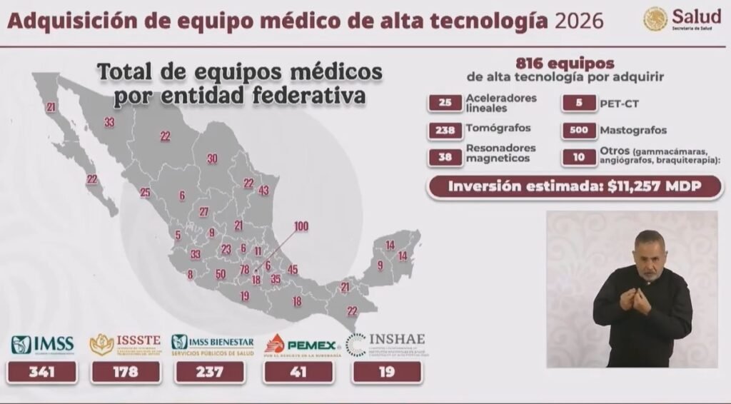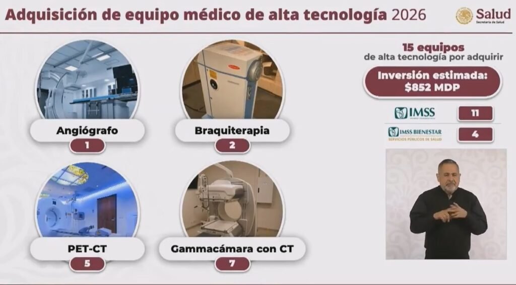 La Secretaría de Salud informó que se destinarán 11 mil 257 millones de pesos para la compra de 816 equipos médicos, entre los que se incluyen resonadores magnéticos, tomógrafos, mastógrafos, aceleradores lineales, gammacámaras y angiógrafos, orientados al diagnóstico y tratamiento de diversas enfermedades, con énfasis en la atención del cáncer.