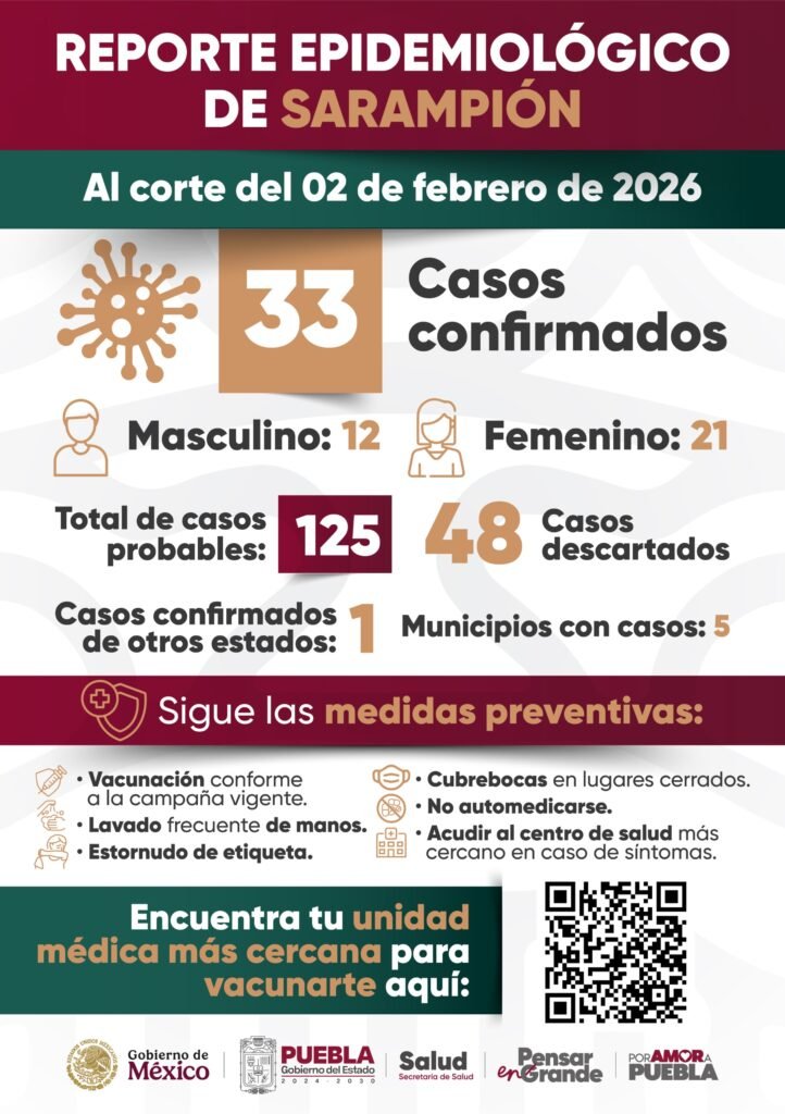 El Gobierno del Estado de Puebla emitió el reporte epidemiológico de sarampión con corte al 2 de febrero de 2026, en el que se confirman 33 casos distribuidos en cinco municipios de la entidad. La información fue dada a conocer por la Secretaría de Salud estatal, en coordinación con autoridades federales.