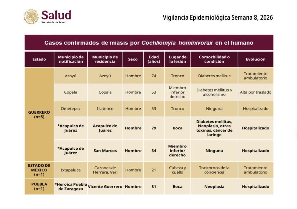 De acuerdo con la dependencia federal, el caso fue identificado durante la última semana de febrero en el municipio de Vicente Guerrero, ubicado a varias horas de la capital poblana. El paciente es un hombre de 81 años que padece neoplasia, condición que habría favorecido la infestación parasitaria.