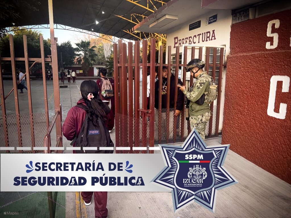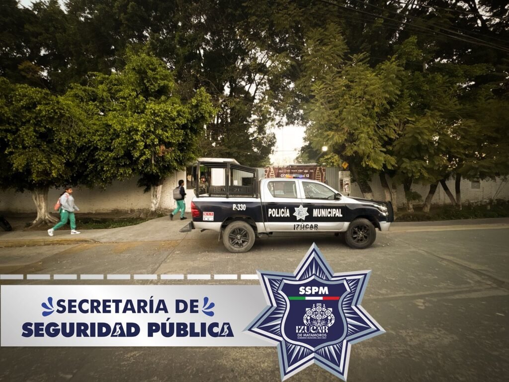 Efectivos de la Marina y de la Secretaría de Seguridad Pública Municipal resguardan distintos planteles educativos en Izúcar de Matamoros. El despliegue de los elementos se enfoca en vigilar las zonas escolares durante los horarios de entrada y salida de los estudiantes.