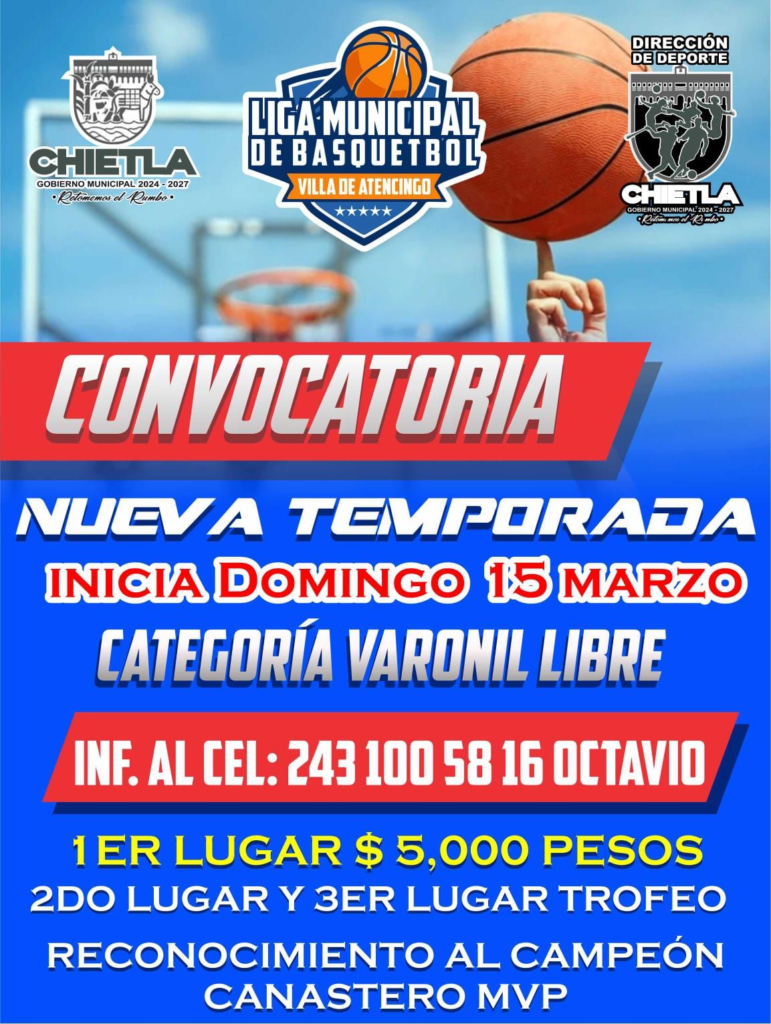 El Gobierno Municipal de Chietla, a través de su Dirección de Deporte, emitió la convocatoria para la siguiente etapa de la Liga Municipal de Básquetbol en la localidad de Villa de Atencingo. La competencia se desarrollará bajo la categoría Varonil Libre y tiene programado su inicio para el domingo 15 de marzo de 2026.