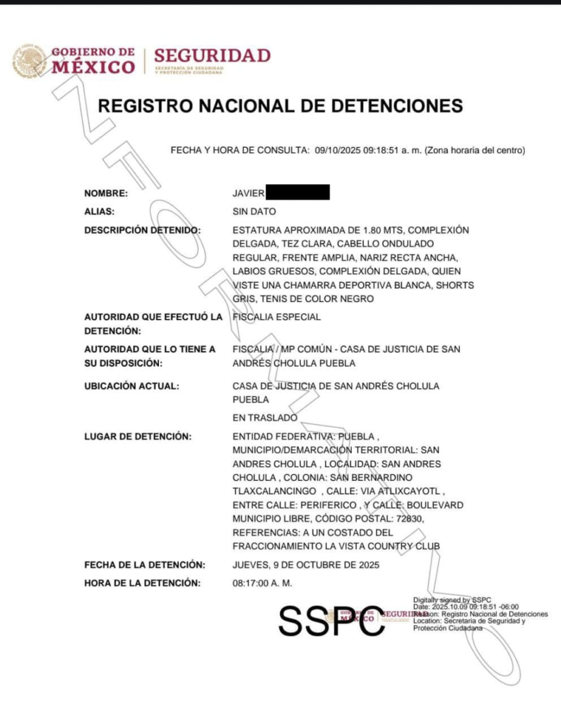 Fue la Fiscalía Especializada de Puebla quien dio cumpliento a la orden de aprehensión a las 08:17:00 am de este jueves a un costado del fraccionamiento La Vista Country Club, información corroborada en el Registro Nacional de Detenciones, al momento del aseguramiento vestía una chamarra deportiva color blanca, shorts gris y tenis de color negro, fue trasladado a Casa de Justicia de San Andrés Cholula.