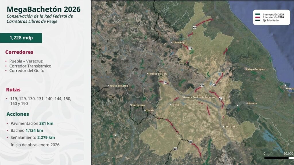 El secretario de Infraestructura, Comunicaciones y Transportes, Jesús Antonio Esteva Medina, explicó que el Gobierno Federal interviene la red federal y estatal de carreteras. En esta primera se ejecutan 25 acciones que abarcan tres kilómetros, mientras que en la segunda se realizan 53 acciones en 612 kilómetros, con trabajos de estabilización de taludes, obras de drenaje y construcción de muros de contención. Además, se atienden 22 puentes que suman dos kilómetros, mediante 12 rehabilitaciones, siete nuevas construcciones y ampliaciones. Las obras iniciarán en marzo.