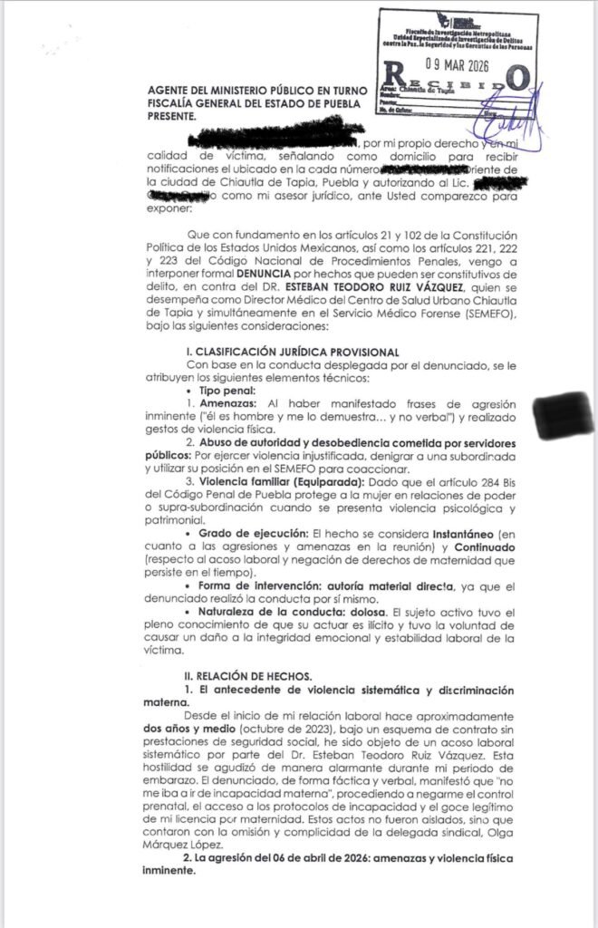 Una trabajadora del Centro de Salud Urbano presentó denuncia ante la Fiscalía General del Estado el 9 de marzo de 2026 contra el médico Esteban Teodoro Ruiz Vázquez, a quien señala por amenazas, abuso de autoridad y violencia en el entorno laboral, hechos que incluyen un incidente ocurrido el 6 de abril durante una reunión con personal de la unidad.