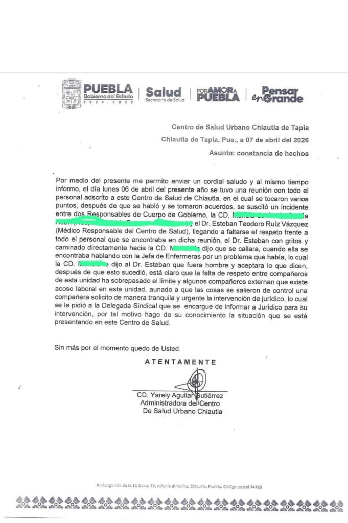 De acuerdo con la constancia de hechos emitida el 7 de abril por la administración del centro de salud, ese día se realizó una reunión con todo el personal, en la que se registró un incidente entre integrantes del cuerpo de gobierno. En el documento se señala que el médico ingresó con gritos y realizó interrupciones durante la participación de una trabajadora.