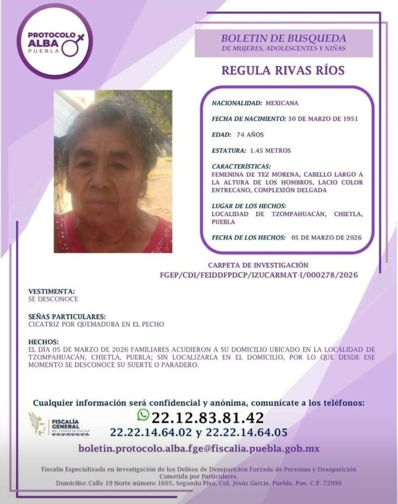 La Fiscalía General del Estado de Puebla activó el Protocolo Alba para la búsqueda de Regula Rivas Ríos, una mujer de 74 años de edad que fue reportada como desaparecida en la localidad de Tzompahuacán, perteneciente al municipio de Chietla.