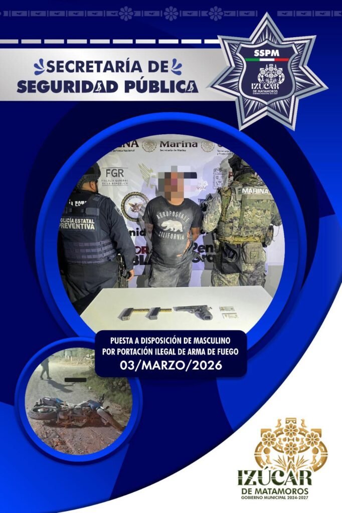Un hombre fue detenido por portación ilegal de arma de fuego durante recorridos de vigilancia realizados el 3 de marzo como parte del Operativo de Mando Coordinado en el municipio de Izúcar de Matamoros, con la participación de elementos de la Policía Municipal, Policía Estatal y personal de la Secretaría de Marina, informó la Secretaría de Seguridad Pública Municipal.