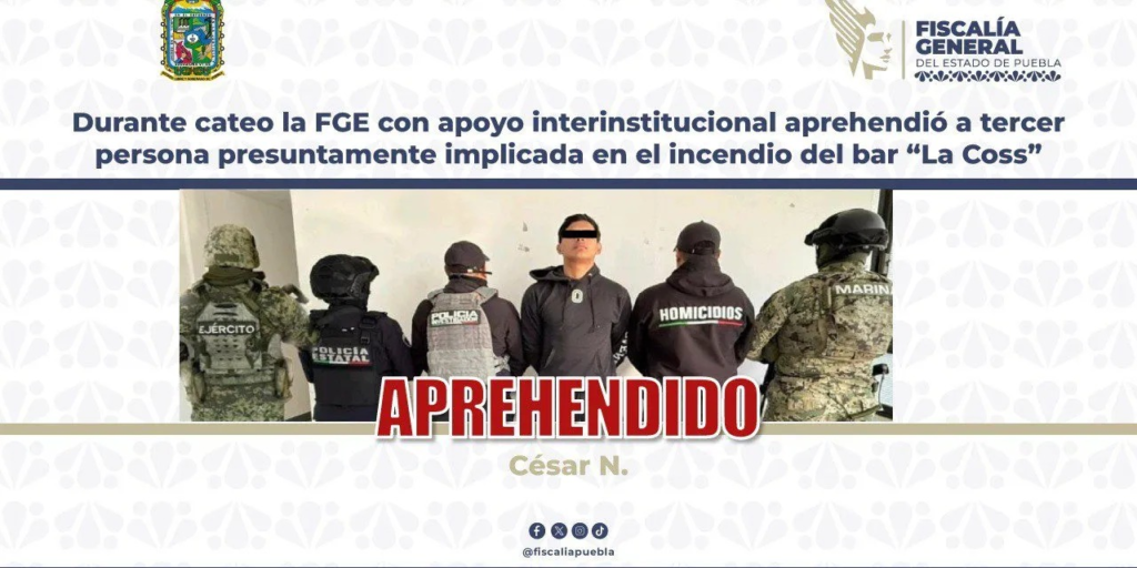 Con la detención de César N., de 19 años, suman tres las personas vinculadas al incendio del bar “La Coss” ya en poder de la autoridad. El primero en ser detenido fue Alejandro N., alias “El Pelón”, días después se aseguró a Isabel N., alias “La Reina de Los Sinaloas” en un operativo desarrollado en el fraccionamiento Lomas de Angelópolis.