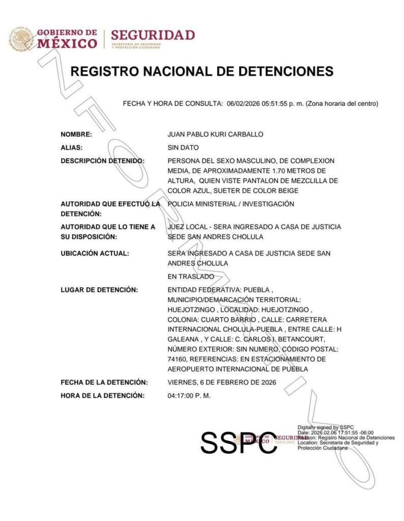De acuerdo con el reporte oficial, la aprehensión se realizó a las 16:17 horas del viernes 6 de febrero de 2026, en el estacionamiento del Aeropuerto Internacional de Puebla.