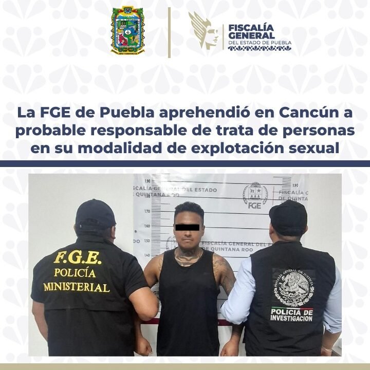 La Fiscalía General del Estado de Puebla informó la detención de Omar N., de 33 años, señalado por el delito de trata de personas en su modalidad de explotación sexual, cometido presuntamente en agravio de su esposa. La aprehensión se realizó en el municipio de Cancún, Quintana Roo, con apoyo de autoridades locales, en cumplimiento de una orden judicial.