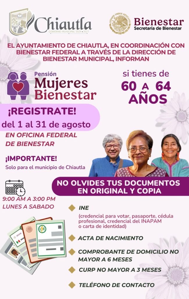 El Gobierno local de Chiautla de Tapia, que preside el edil Gonzalo Oropeza García, informó que ya dio inicio el proceso de registro para la pensión “Mujeres Bienestar”, dirigido a las féminas de 60 a 64 años con residencia en el municipio.
