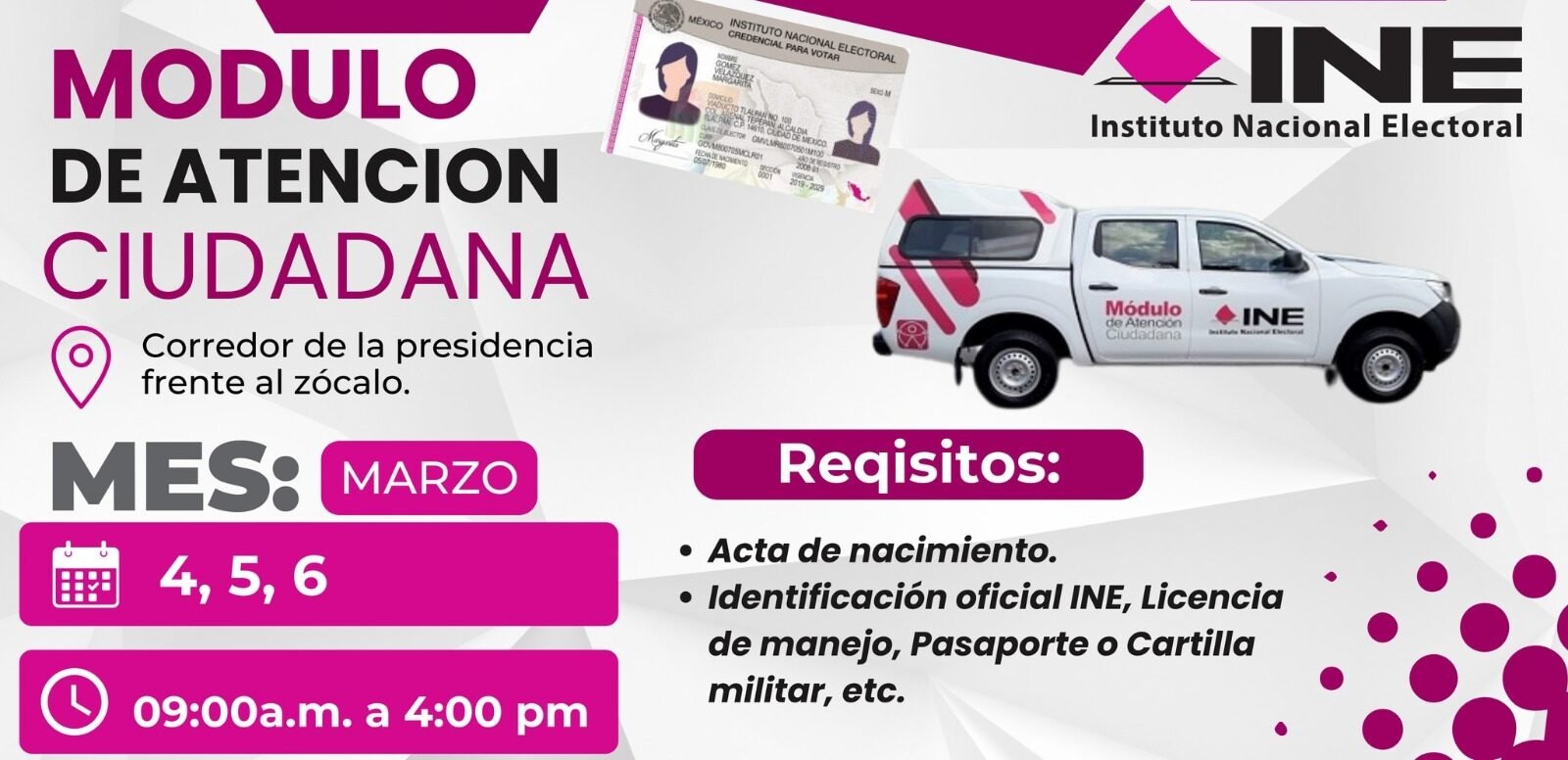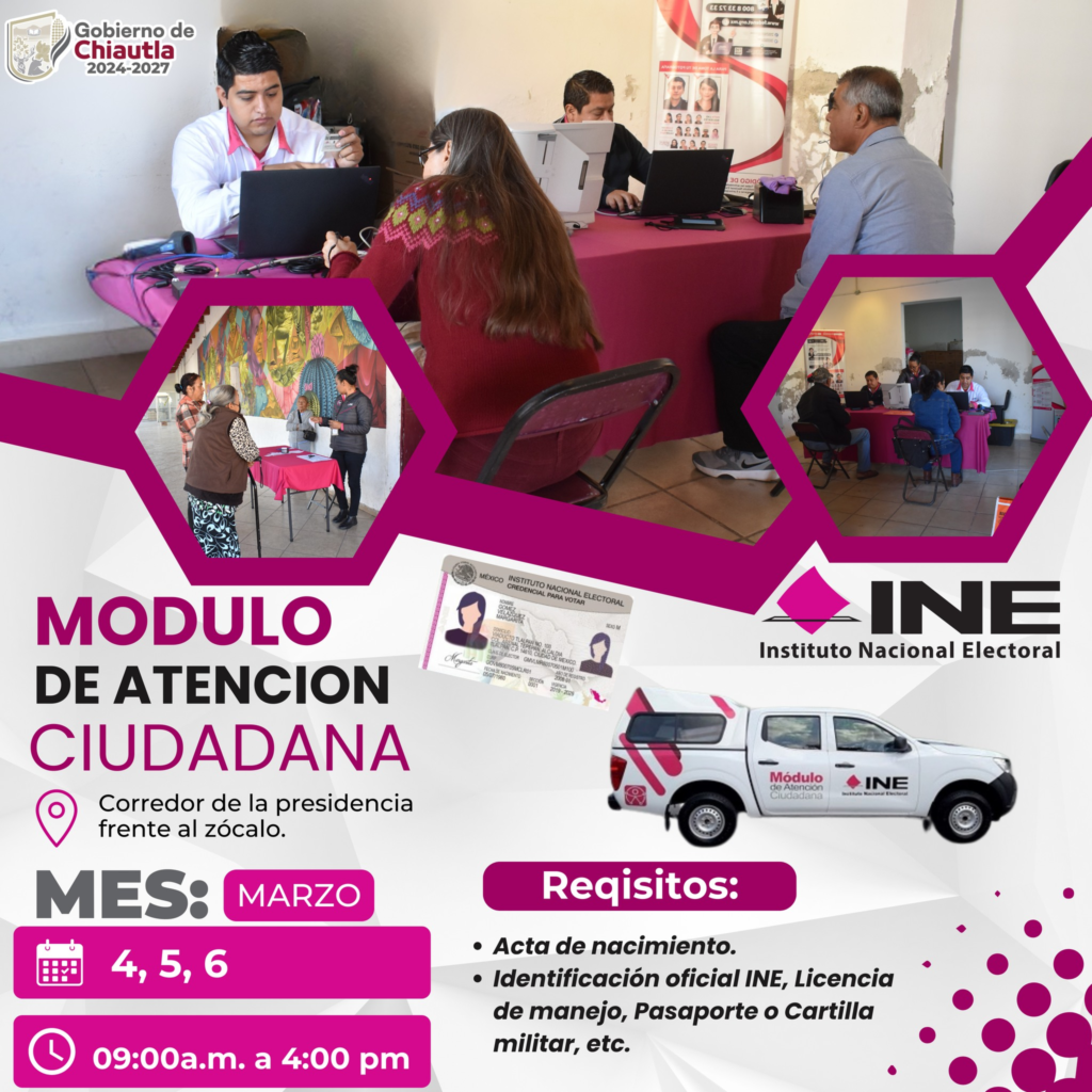 El Instituto Nacional Electoral (INE) habilitó una unidad de atención ciudadana en el municipio de Chiautla con el fin de facilitar el acceso a trámites relacionados con la credencial para votar. El módulo se encuentra ubicado en el corredor de la Presidencia Municipal, en la zona centro de la localidad.