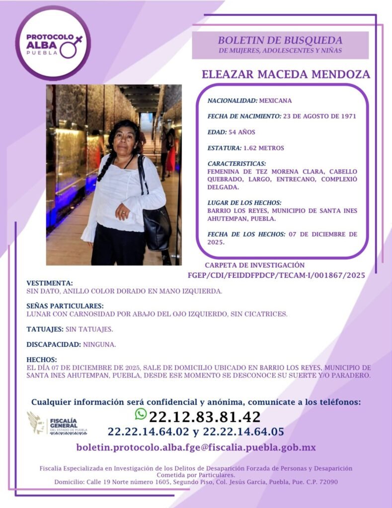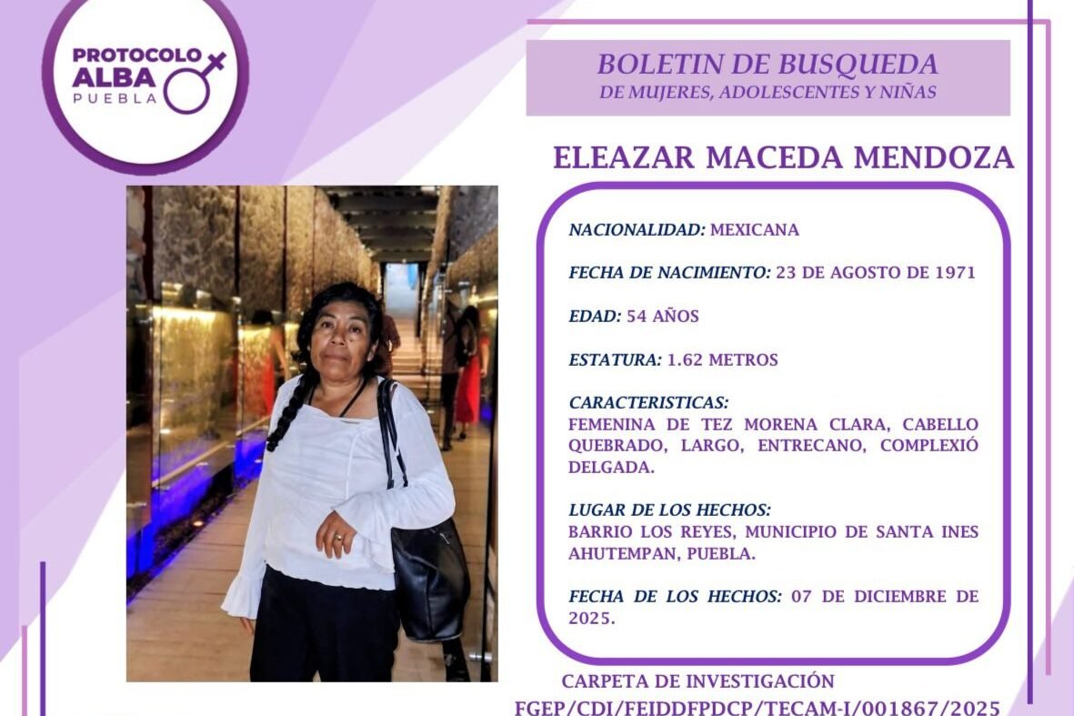 En el municipio de Santa Inés Ahuatempan, autoridades municipales y estatales mantienen labores de localización de Eleazar Maceda Mendoza, mujer reportada como desaparecida desde el pasado 7 de diciembre.