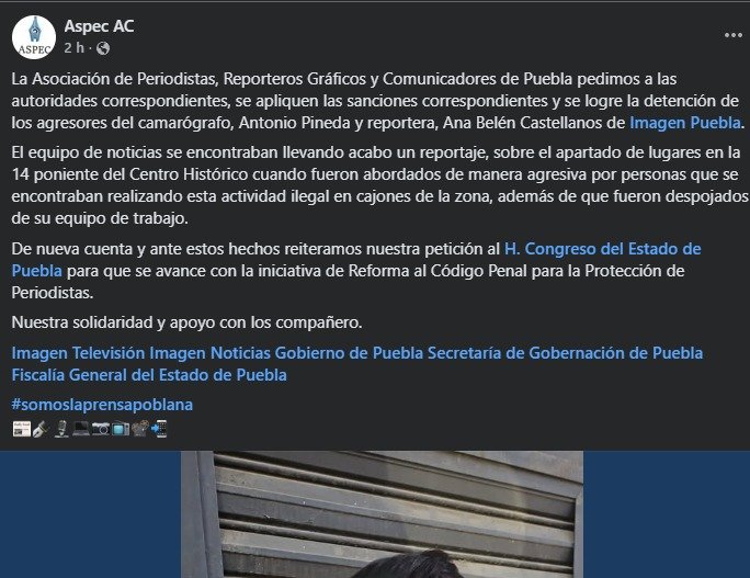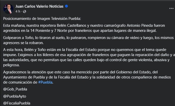 Por su parte, la Asociación de Periodistas, Reporteros Gráficos y Comunicadores de Puebla condenó la agresión y solicitó que se apliquen las sanciones previstas en la ley contra quienes resulten responsables.