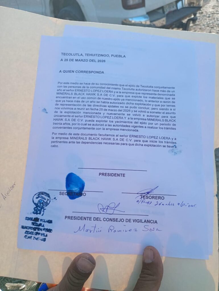Habitantes de la comunidad de Tecolutla denunciaron que la empresa Minerals Black Hawk pretende extraer material pétreo durante 30 años en terrenos del municipio de Tehuitzingo sin presentar la Manifestación de Impacto Ambiental (MIA) ante la Secretaría de Medio Ambiente y Recursos Naturales, mediante un convenio que no ha sido avalado por la asamblea ejidal.