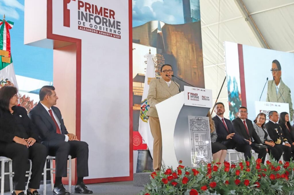 La secretaria de Gobernación federal, Rosa Icela Rodríguez, representante personal de la presidenta Claudia Sheinbaum, reconoció los resultados del primer año de gobierno estatal ya que la coordinación es permanente, pues la presidenta le tiene un genuino cariño a Puebla y a los poblanos, lo que los asistentes retribuyeron al corear: “¡Presidenta, presidenta!”.
