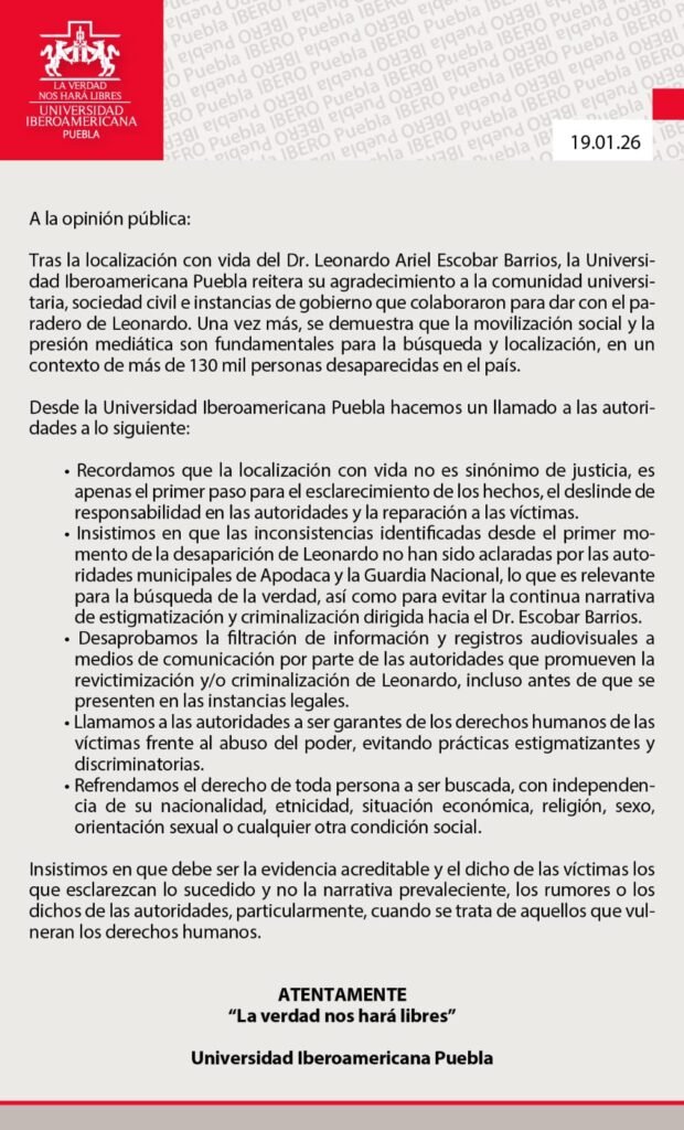 La Universidad Iberoamericana Puebla informó la localización con vida del Dr. Leonardo Ariel Escobar Barrios, académico de esta casa de estudios, y reiteró su agradecimiento a la comunidad universitaria, sociedad civil e instancias de gobierno que colaboraron en su búsqueda.