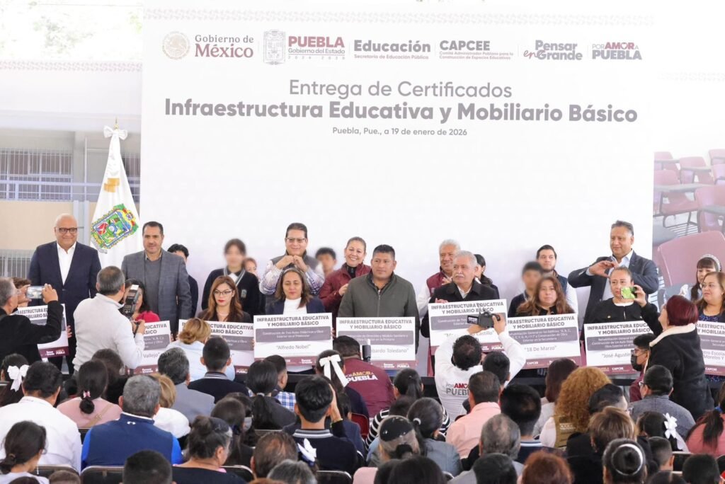 CIUDAD DE PUEBLA, Pue.– Con la entrega de 46 certificados de Infraestructura Educativa y 104 de Mobiliario Básico en el Centro Escolar José María Morelos y Pavón, el Gobierno del Estado reafirmó que la educación es una prioridad para el gobernador Alejandro Armenta, señaló la secretaria de Bienestar, Laura Artemisa García Chávez, al destacar que estas acciones impulsan la dignificación de los espacios escolares en Puebla, con una inversión total cercana a los 122 millones de pesos.