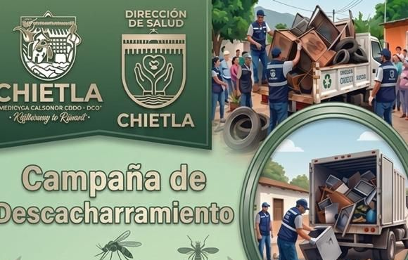 Este martes 10 de marzo de 2026, el Ayuntamiento de Chietla, a través de las áreas de salud municipal, lleva a cabo una jornada de descacharramiento en las localidades de Pueblo Nuevo y Jaltepec. La actividad tiene como fin la eliminación de objetos que acumulan agua y funcionan como criaderos del mosquito transmisor de dengue, zika y chikungunya.