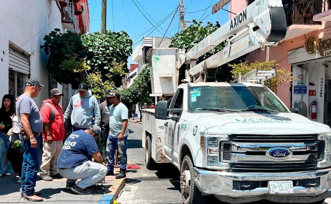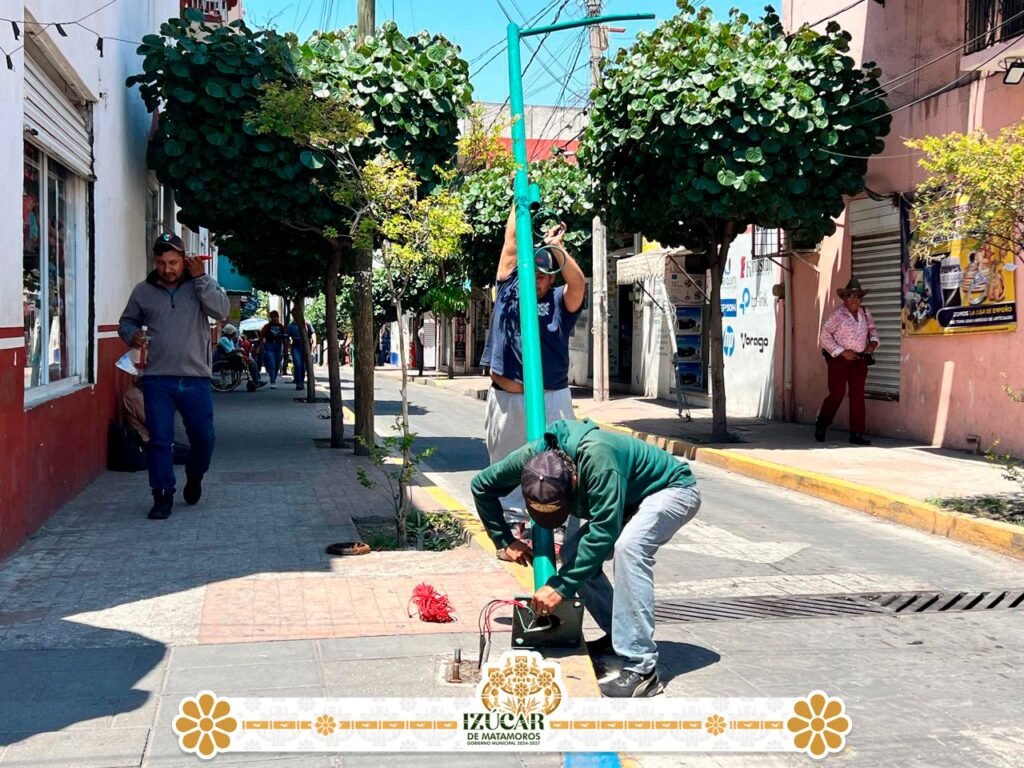 El Ayuntamiento de Izúcar de Matamoros lleva a cabo labores de mantenimiento en la red de alumbrado público sobre la calle Aquiles Serdán.