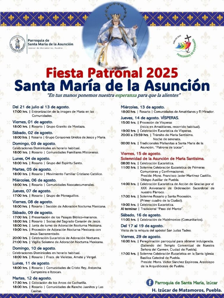 El punto culminante de estas festividades será el 15 de agosto, día de la Solemnidad de la Asunción de María Santísima, con misas programadas desde las 8:00 de la mañana. Dos días después, el 17 de agosto, llegarán a Izúcar las reliquias de San Judas Tadeo, provenientes de la Basílica de San Salvatore in Lauro en Roma. Este acontecimiento representa una oportunidad única para los feligreses, quienes podrán venerar al “Santo de las Causas Difíciles” en un evento de gran relevancia espiritual.