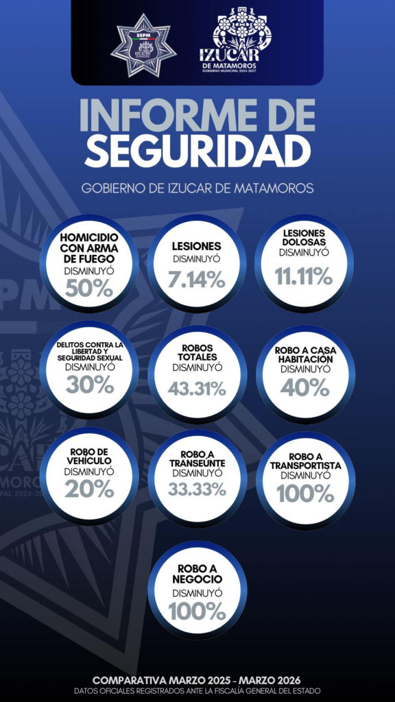 El Gobierno municipal informó que, mediante acciones de seguridad implementadas por la Secretaría de Seguridad Pública, se registró una reducción en la incidencia delictiva entre marzo de 2025 y marzo de 2026, con base en datos reportados ante la Fiscalía General del Estado.