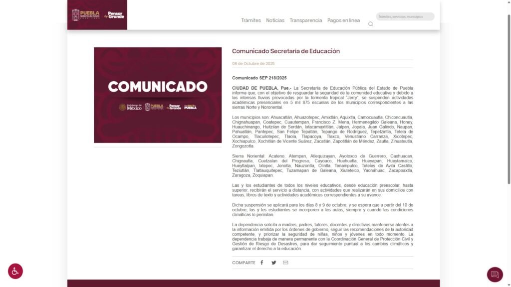 La tormenta tropical “Jerry” obligó a la secretaría de educación pública en Puebla a suspender clases presenciales en más de cinco mil escuelas. La medida afecta a todos los niveles educativos, desde preescolar hasta superior, en 61 municipios de las sierras norte y nororiental del estado.