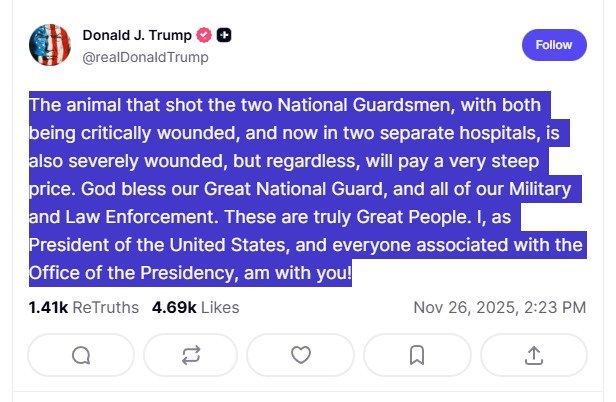 El presidente Trump, reaccionó ante el incidente mediante un mensaje en su red social oficial: condenó el ataque, calificó al agresor como un “animal” y aseguró que pagaría “un precio muy alto”. Afirmó su respaldo a los miembros de la Guardia Nacional, las fuerzas del orden y el personal militar, y ofreció solidaridad a las familias de las víctimas.