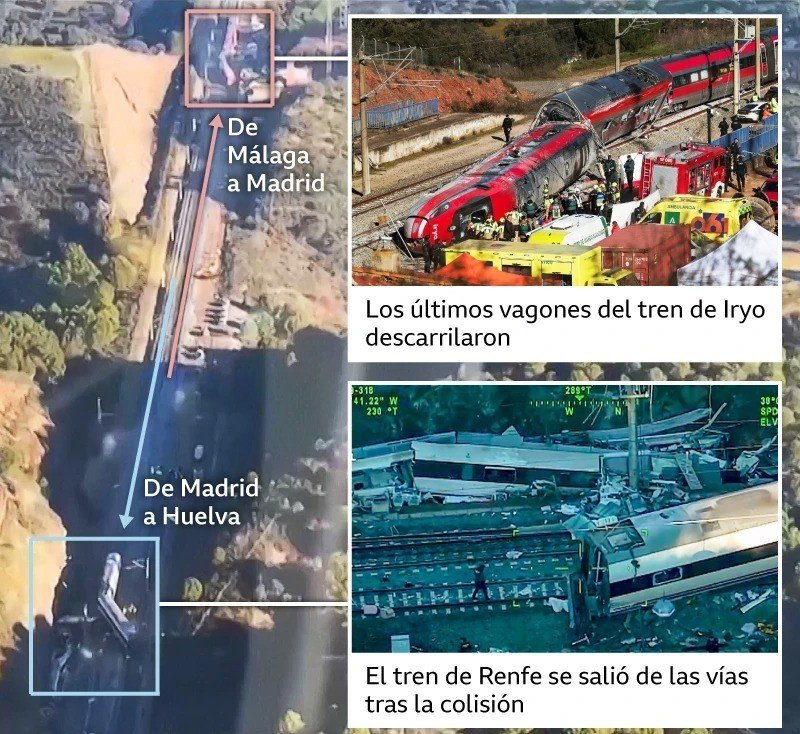 El accidente ocurrió alrededor de las 19:45 horas (hora local), en un tramo recto de la línea que conecta Madrid con Andalucía. De acuerdo con los primeros reportes, la cola de un tren Intercity de la empresa Iryo, que viajaba de Málaga a Madrid, se salió de la vía e invadió el carril contrario, donde circulaba un tren de Renfe con destino a Huelva.