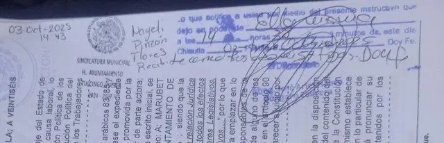 El documento muestra que Pinzón Flores recibió y firmó la notificación de la demanda laboral el 3 de octubre de 2025, utilizando el sello de la Sindicatura Municipal. El trabajador asegura que, tras presentar la demanda por el cese de pagos, dejó de recibir su salario.