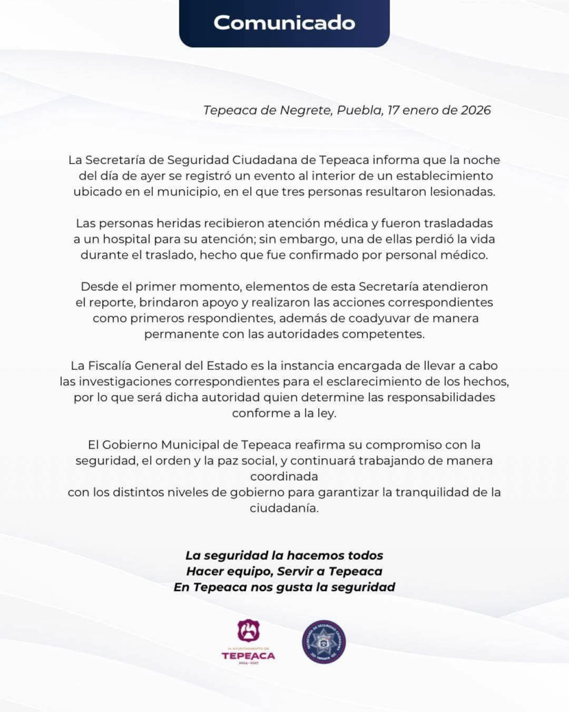 Sobre lo ocurrido, el H. Ayuntamiento de Tepeaca, a través de la Secretaría de Seguridad Ciudadana municipal, emitió un comunicado oficial en sus redes sociales en el que confirmó los hechos.